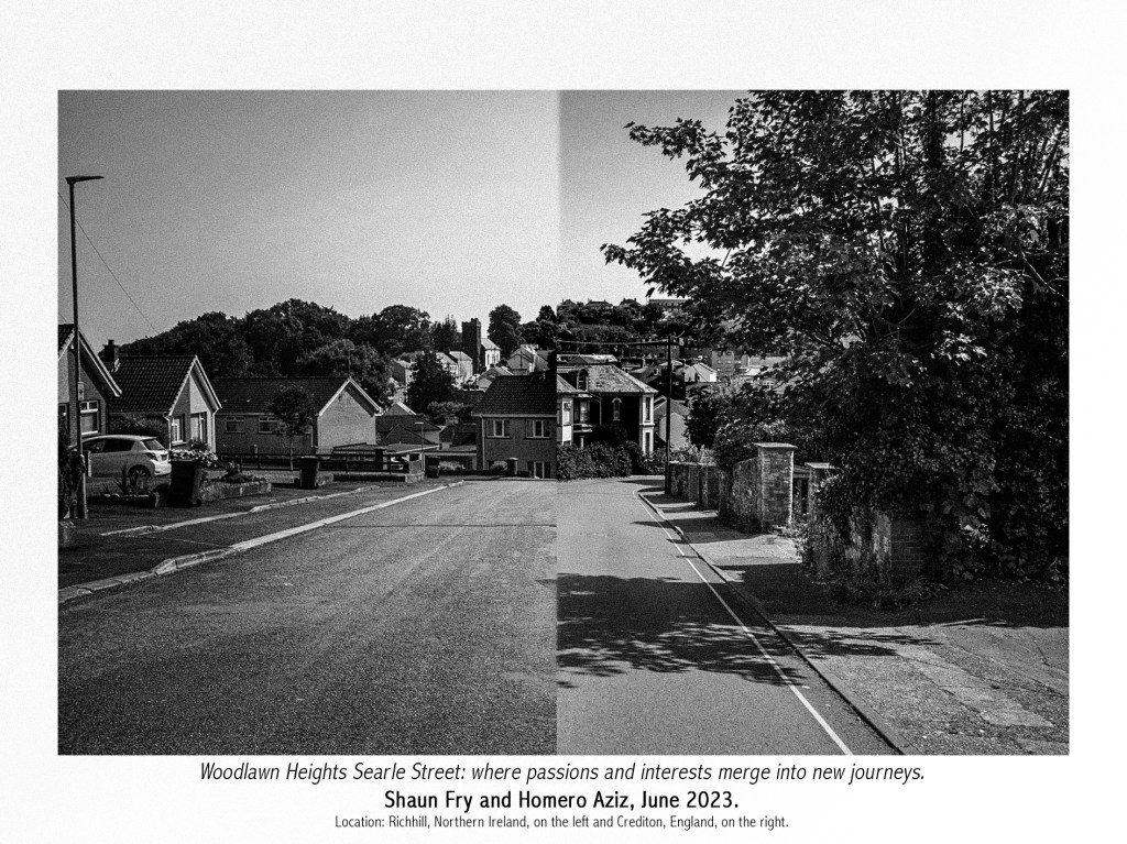 Non-intentionally images were taken on a similar level and had harsh tree shadows that created a sense of discomfort revealing that they were taken on different places pointing out to the collaboration aspect. On the editing aspect, both Shaun and Homero are passionate for photography technology (analog or digital) considering themselves camera geeks, so many discussions around the mini project were related to this topic and how this could impact the final result of their work or future assignments. Both also love Black and White and filmish style of editing so for this activity it was common sense to edited as it ended to be. The caption was also written with the same purpose merging the names of the streets of the photographer’s homes. Finally, it’s worth to be mentioned that the central line of image reminds us of the gutter of a photobook, splitting both two worlds and points of view of the photographers.